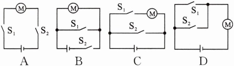 5. (自贡市中考)在富顺高铁站的自动检票闸机口,乘客需刷身份证,同时进行人脸识别,两个信息都符合后闸机门(电动机)才自动打开,检票通过。身份证和人脸识别系统都相当于开关,信息符合后开关自动闭合。下列电路中,符合上述要求的是(