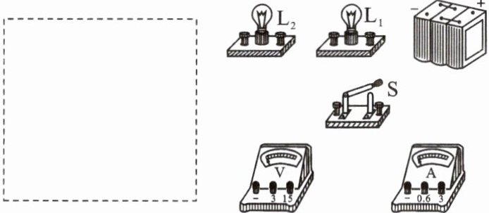 12. 利用下图中提供的实验器材,要求使$L_1$和$L_2$两灯串联在电路中,并用电流表测通过$L_1$的电流,用电压表测$L_2$两端的电压。