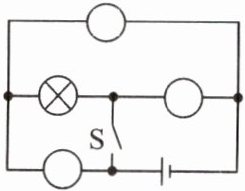 14. [科学推理]如图所示电路中有两个小灯,请在图中○内,分别填入⨂及ⓐ或ⓥ的符号,要求开关闭合时两灯串联且均能发光,且两电表的示数均不为零。