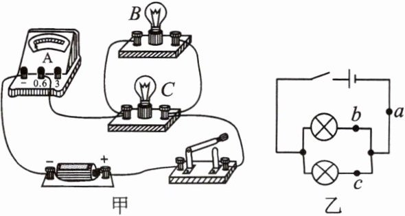 (选填“$a$”“$b$”或“$c$”)的电流。(2)在测并联电路中的电流时,若小民同学先在乙图的$a$处测得电路中的电流为 1.2A,然后在$b$、$c$处测得电流都为 0.6A,于是小民得出结论:并联电路中干路电流等于支路电流之和,且支路电流都相等。他的结论