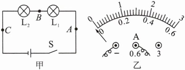 (1)为了验证猜想一,用电流表分别测出图甲中$A$、$B$、$C$三处的电流。闭合开关$S$,发现电流表指针偏转如图乙所示,其原因是