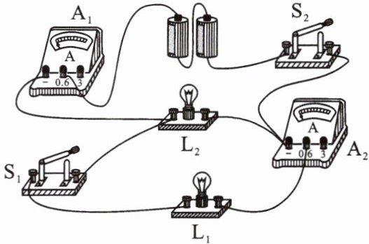 )A.两灯串联,两电流表示数相同