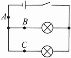 。如图所示,将电流表分别接在电路中$A$、$B$、$C$处,测出通过各处的电流分别为$I_{A}$,$I_{B}$,$I_{C}$,它们之间的关系是$I_{A}=I_{B}+I_{C}$