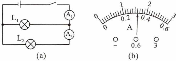 9. [科学推理]在“用电流表测电流”的实验中,某同学接成图(a)所示的电路;当开关闭合后,两灯都发光,两个电流表的指针所指位置均为图(b)所示,则灯$L_{2}$的电流为