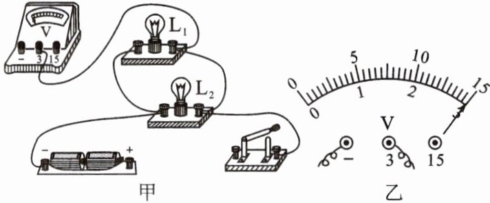 (3) 排除故障后,用电压表分别测量小灯泡$L_{1}$、$L_{2}$及电源两端的电压,电压表示数均如图乙所示,为____V。更换不同规格的小灯泡多次测量,发现电压表示数均如图乙所示。由此得出结论:并联电路中各支路用电器两端的电压与电源两端的电压____。