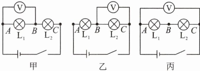 (填出一种即可)。(3) 小明分别测出$AB$、$BC$、$AC$间的电压并记录在如下表格中,分析实验数据得出结论:串联电路总电压等于各部分电路两端电压之和。请对小明的做法进行评价(指出不足之处):