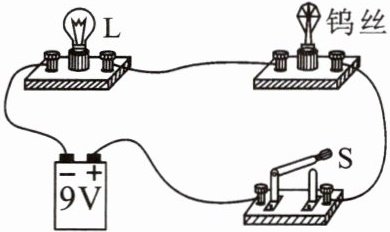 8. 如图所示的钨丝是将一个白炽灯去除玻璃罩制成的,闭合开关 S,小灯泡 L 发光,钨丝不发光,向钨丝吹气时,小灯泡 L 变亮,用酒精灯给钨丝加热,小灯泡 L 逐渐变暗直至熄灭,由实验可知(