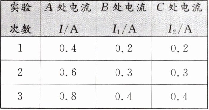 (4)排除电路故障,闭合开关,读出 A 处的电流,再将电流表分别接到图甲中 B、C 两处测量。小明在实验中记录了如下数据。