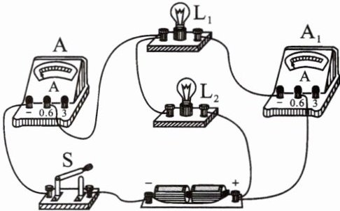 3. (鄂州市中考)如图所示的实验电路,闭合开关$S$后,电流表$A的示数为0.5A$,电流表$A_1的示数为0.3A$。下列说法正确的是(