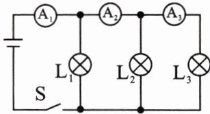 4. 如图所示,闭合开关$S$后,三个电流表$A_1$、$A_2$、$A_3的示数分别是1.5A$、$0.8A$、$0.5A$,则通过灯$L_1和L_2$的电流分别为