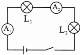 2. 如图所示,在探究串联电路电流特点时,闭合开关后,发现电流表$A_1和A_2的示数分别为0.28A和0.26A$,造成该现象的原因可能是(