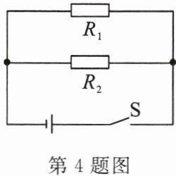 4. 如图所示的电路中,电阻阻值 $R_{1}>R_{2}$。开关 $S$ 闭合后,$R_{1}$、$R_{2}$ 两端的电压分别为 $U_{1}$、$U_{2}$,通过 $R_{1}$、$R_{2}$ 的电流分别为 $I_{1}$、$I_{2}$,则(
