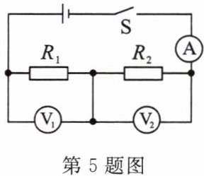 5. 如图所示,电源电压为 $6V$,闭合开关 $S$,电压表 $V_{2}$ 示数为 $4V$,电流表示数为 $0.4A$,则电压表 $V_{1}$ 的示数为