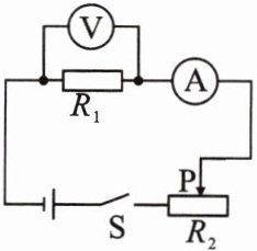 15. [科学推理]如图所示的电路中,电源电压保持不变。闭合开关,滑动变阻器的滑片 $P$ 从某点移动到另一点时,电压表的示数从 $6V$ 变为 $5V$,电流表的示数变化了 $0.2A$。则定值电阻 $R_{1}$ 的阻值为