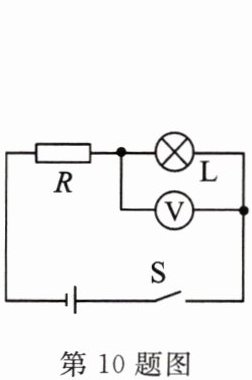 10. 如图所示,电源电压 $U = 10V$,定值电阻 $R = 20Ω$,闭合开关 $S$,电压表的示数是 $6V$,通过小灯泡的电流是(