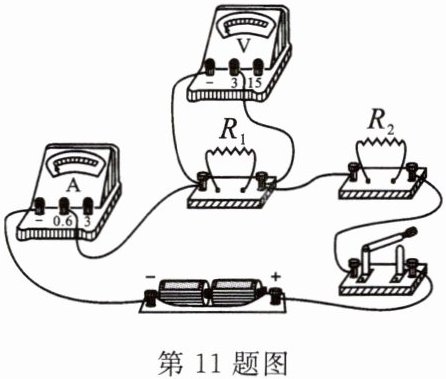 11. 如图所示实物电路中,电源由两节新干电池串联而成,$R_{1}$ 和 $R_{2}$ 为定值电阻。当开关闭合后,电压表和电流表的示数分别为 $2V$ 和 $0.2A$,则 $R_{2}$ 的阻值为