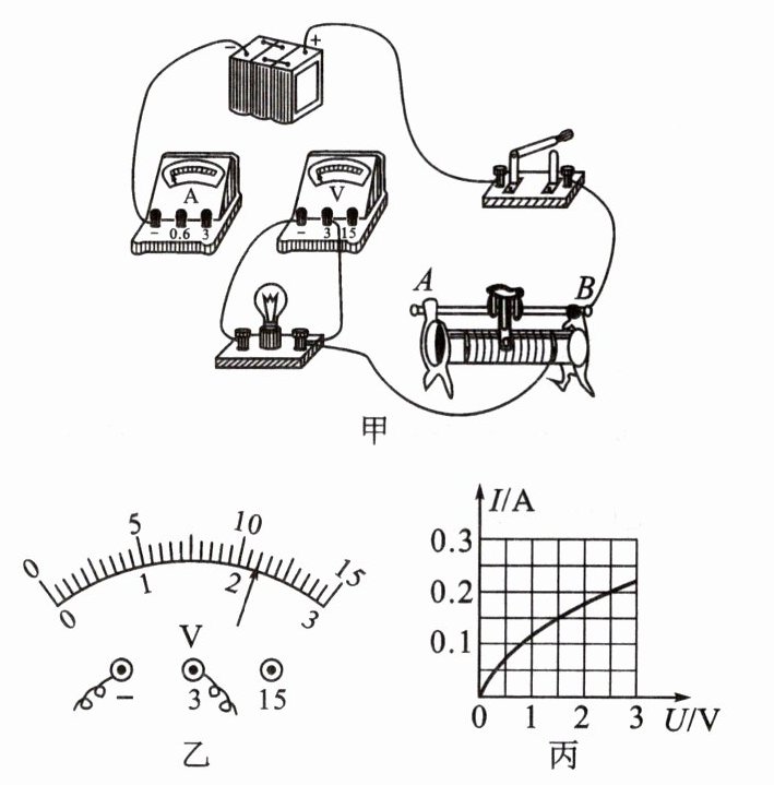 (2) 闭合开关,移动滑片,发现电压表的示数如图乙所示,其读数为____V;为了测量小灯泡正常发光时的电阻,应将滑片向____(选填“A”或“B”)端移动。