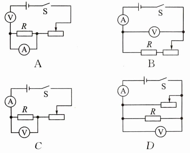 5. 如图是四位同学设计的用伏安法测电阻$R$的电路图,其中正确的是(