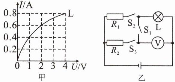 5. 灯泡$L的I-U$图像如图甲所示,电阻$R_{1}的阻值是10\Omega$,电源电压是$8V$。在图乙所示的电路中,若只闭合开关$S_{1}和S_{2}$时,电压表的示数是$2V$,此时电路中的电流是______