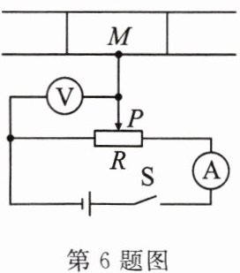 6. (内江市中考)计算机鼠标内装有自动控制传感器,其工作原理电路如图所示。物体M在导轨上左右移动时,可带动与之相连的滑动变阻器的滑片P左右移动,通过电压表示数变化可反映出物体M移动的距离。当开关S闭合,物体M向右移动时(