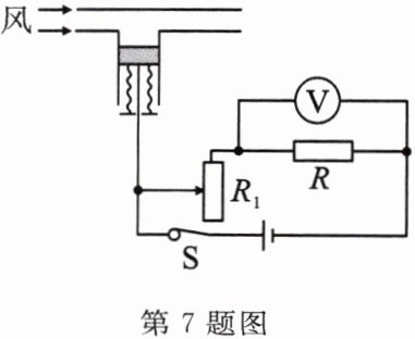 7. 如图所示是一种风速测定装置。其中风速表是由电压表改装而成,R为定值电阻$,R_1$为滑动变阻器,“T”型管道的竖直管内装有可上下自由移动的轻质活塞,活塞通过轻质细杆和滑动变阻器的滑片相连。则风速变大时(