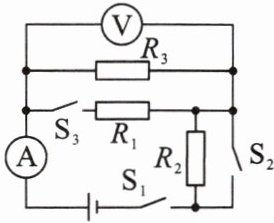 3. 如图所示的电路中,电源电压保持不变,先闭合开关$S_1,$电流表、电压表的示数分别为$I_1、$$U_1,$再闭合开关$S_2、$$S_3,$电流表、电压表的示数分别为$I_2、$$U_2,$则下列结论正确的是(
