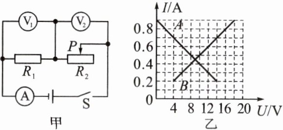 6. 如图甲所示电路,电源电压保持不变,闭合开关$S$。当滑动变阻器的滑片$P$从右端滑到左端的过程中,$R_1$、$R_2的I - U$关系图像如图乙所示。则下列判断正确的是(