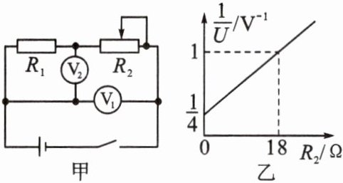 5. 如图,在图甲所示电路中,电源电压保持不变,闭合开关,移动滑片使电阻$R_2$的有效阻值从零逐渐变大,$R_1的电压U的倒数与R_2$的阻值变化的图像如图乙所示,则(
