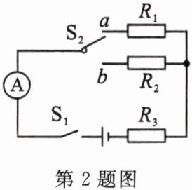 2. (福建省中考)如图电路,电源电压恒定,$R_1 = 12Ω$,$R_2 = 6Ω$,$R_3$是定值电阻。闭合开关$S_1$,单刀双掷开关$S_2接a时电流表的示数为0.6A$;接$b$时电流表的示数可能为(