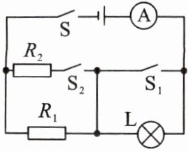 (3)S、$S_{1}$、$S_{2}$都闭合时,$R_{1}$与$R_{2}$并联,电流表A测干路电流$I_{并},U_{1}=U_{2}=U=$$15V,R_{1}$电流$I_{1}=\frac {U_{1}}{R_{1}}=\frac {15V}{25\Omega }=0.6A;$$R_{2}=\frac {U_{2}}{I_{2}}=\frac {U_{2}}{I_{并}-I_{1}}=\frac {15V}{0.9A-0.6A}=$$50\Omega $。