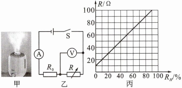 9. 如图甲所示为一个超声波加湿器,如图乙所示为其内部湿度监测装置的简化电路图。已知电源电压为$12V$,定值电阻$R_0的阻值为20Ω$,湿敏电阻$R的阻值随湿度R_H$变化的关系图像如图丙所示,其阻值最大为$120Ω$(图中未画出)。在电路安全工作的前提下,求: