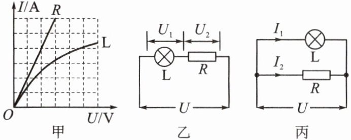 8. (凉山州中考)如图所示,甲图是灯泡$L和定值电阻R的I - U$图像,将$L和R$先后以乙、丙图两种方式连在同一电源上,若乙图中$U_1:U_2 = a$,丙图中$I_1:I_2 = b$,则下列选项中不正确的是(