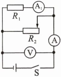 解:由电路图可知,$R_{1}$与$R_{2}$并联,电流表$A_{1}$测$R_{1}$支路的电流,电流表A测干路电流,电压表测电源的电压。