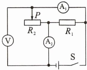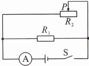 8.(内江市中考)在如图所示的电路中,电源电压恒为 12V,定值电阻$R_1$的阻值为 5Ω,滑动变阻器$R_2$标为“50Ω 2A”的字样,电流表的测量范围为 0~3A。闭合开关 S,滑动变阻器的滑片 P 从最右端($R_2 = 50Ω$)移动到连入电路中的电阻值为 20Ω 处,电流表的示数从$I_1变为I_2$,则$I_2与I_1$之差为(