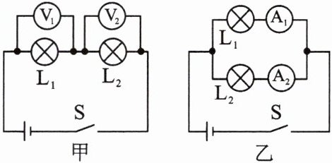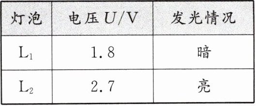 判断;(2) 一位同学用干电池做电源,把 $ L_1 $“$ 2.5V $ $ 0.3A $”和 $ L_2 $“$ 3.8V $ $ 0.3A $”两只灯泡连成如图甲所示电路。闭合开关进行实验。收集数据如下表: