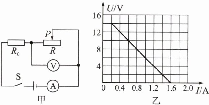 11. [科学推理]如图甲所示的电路中,电源电压为 $ 16V $ 恒定不变,$ R_0 $ 为定值电阻,$ R $ 为滑动变阻器,闭合开关 $ S $ 后,在滑片 $ P $ 从一端滑向另一端的过程中,电压表与电流表示数的变化关系如图乙所示,根据图像信息可知,下列判断不正确的是(