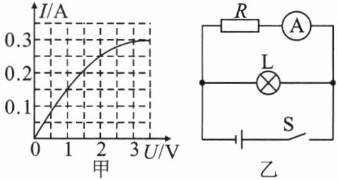 9. (河南省中考)如图甲为灯泡 $ L $ 的电流与电压关系的图像,将该灯泡接入图乙电路,电阻 $ R $ 阻值为 $ 10\Omega $,闭合开关 $ S $,电流表示数为 $ 0.2A $,则电源电压为