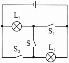 10. 如图所示,只闭合开关 $ S $ 时灯 $ L_1 $ 的功率为 $ 9W $;断开开关 $ S $,闭合 $ S_1 $、$ S_2 $ 时,灯 $ L_1 $ 的功率为 $ 25W $。电源电压不变,忽略温度对灯丝电阻的影响。则 $ L_1 $ 与 $ L_2 $ 电阻之比是