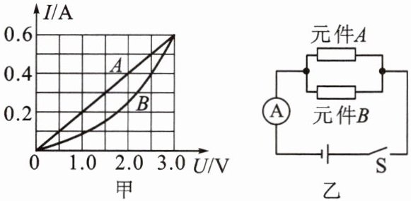 7. 有两个电路元件 $ A $ 和 $ B $,通过元件的电流与其两端电压的关系如图甲所示。把它们并联在电路中,如图乙所示,闭合开关 $ S $,这时电流表的示数为 $ 0.9A $,则电源电压和元件 $ B $ 的电功率分别是(