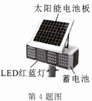 4. 如图所示为一款爆闪警示灯,常放置在存有安全隐患的危险路段,通过有规律的爆闪,起到有效的警示作用。太阳能电池板是一种利用太阳光直接发电的光电半导体薄片,白天,太阳能电池板给蓄电池充电,蓄电池再给LED红蓝灯供电,LED红蓝灯发光时几乎不发热,则(