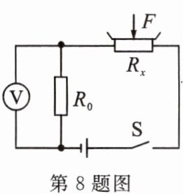 8. 如图所示,这是某电子秤的内部简化电路,$R_{0}$是定值电阻,$R_{x}$是压敏电阻,其阻值随着压力增大而减小,该电子秤的示数表是由电压表改装而成的,电源电压恒定不变。闭合开关$S$,下列说法正确的是(