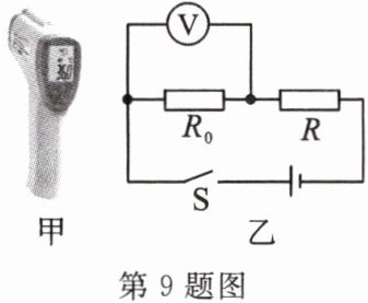 9. 如图甲是医务人员使用的测温仪,图乙是它的工作原理图,其中电源电压保持不变,定值电阻$R_{0}$为保护电阻,$R$是热敏电阻,用于靠近人体测温,当病人体温较高时,电压表的示数变大,则下列分析正确的是(