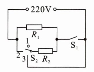 (2)旋钮开关放在2位置时,电路为R₁的简单电路,总电阻较小,电源电压不变,根据P=U²/R可知总功率较大,电陶炉处于高温挡,根据P=U²/R可知高温挡额定功率:Pₕᵢgₕ=U²/R₁=(220V)²/48.4Ω=1000W;