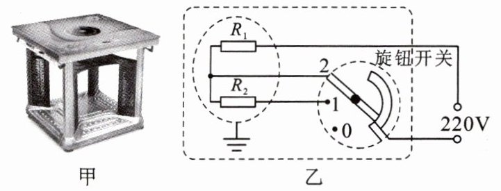 15. (兰州市中考)一款内置电陶炉的电暖桌如图甲所示,它不仅具有桌面暖手、桌底暖脚功能,还可以烧水、煮茶等。电陶炉的简化电路如图乙所示,其参数如表所示,高温挡额定功率字迹已被磨损。旋转旋钮开关,可实现停止工作、低温挡和高温挡的转换。$ R_{1} $ 和 $ R_{2} $ 均为电热丝,$ R_{2} = 72.6\Omega $。求:
