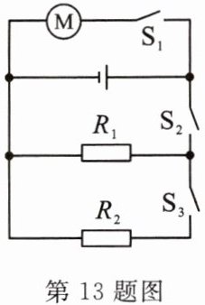 13. 如图是简易榨汁杯的电路原理图,工作时有榨汁、加热、保温三挡。当闭合开关______时,榨汁杯处于榨汁挡;只闭合开关 $ S_{2} $ 时,榨汁杯处于______。