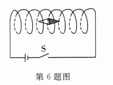 6. 如图所示,螺线管内放一枚小磁针,当开关S闭合后,小磁针的北极指向将(
