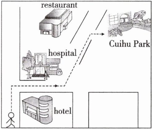 Cuihu Park is not far from here. It's easy to get there. Just go straight and turn right at the first corner. Walk along the road and turn left when you find a hospital. Cuihu Park is down the street on your right. Across from the park is a restaurant. The park is really a good place to have fun. It's beautiful and cool with many trees and flowers. You can swim, play games or have a picnic there. It's very relaxing. You may also get a good chance to practice Chinese. I hope you will enjoy yourselves.