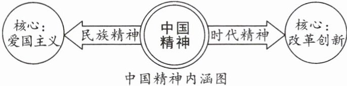(1)中国精神包含时代精神和民族精神,其中时代精神的核心是改革创新,而民族精神的核心是爱国主义。(意思对即可)