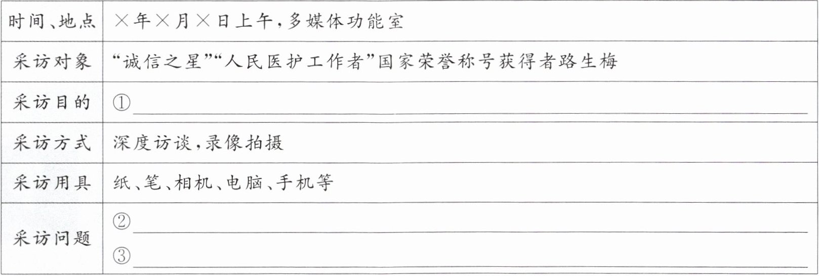 3.【完善采访】为勉励青年向英雄学习,时事速递团成员决定视频采访英雄模范路生梅,请结合“人物通讯”完善采访提纲。(3 分)
