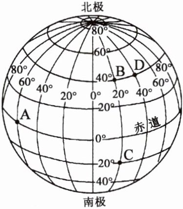 (填“能”或“不能”)在北极会合。(4) A、B、C、D 四点中,位于南半球的有